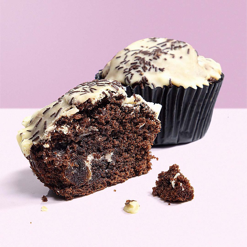 Chocolate muffin with black glace cherries, chocolate chips, cream & black cherry flavour filling with a decadent white chocolate flavour topping. Vegetarian friendly.